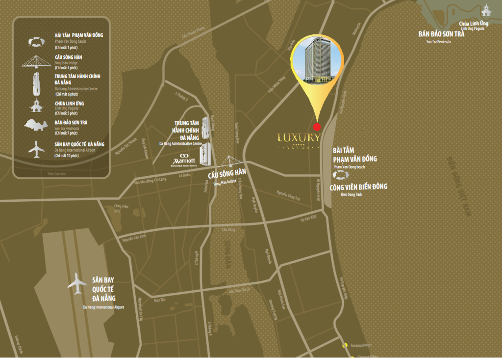Tọa lạc tại con đường 5 sao, Luxury Apartment Đà Nẵng sẽ là một lựa chọn an cư xứng tầm, dễ dàng kết nối với các khu vực chính trị - hành chính quan trọng. Từ dự án chỉ mất 10 phút để đến sân bay quốc tế Đà Nẵng, 7 phút di chuyển đến trung tâm thành phố, hỗ trợ tối đa việc di chuyển đến các vùng lân cận. Với trục đường lớn, thoáng rộng, đây sẽ là lựa chọn lý tưởng cho chủ nhân năng phải đi lại.